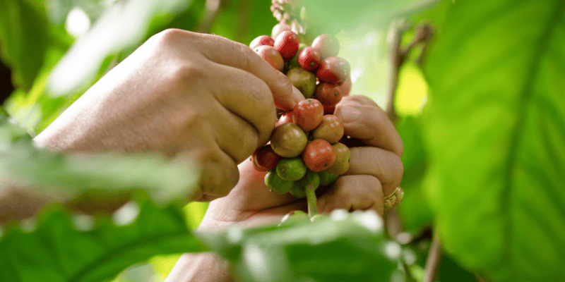 Clusters of unripe green coffee cherries are attached to branches surrounded by lush green leaves. The composition highlights the vibrant and fresh appearance of the coffee plant, suggesting a natural and thriving growth environment.